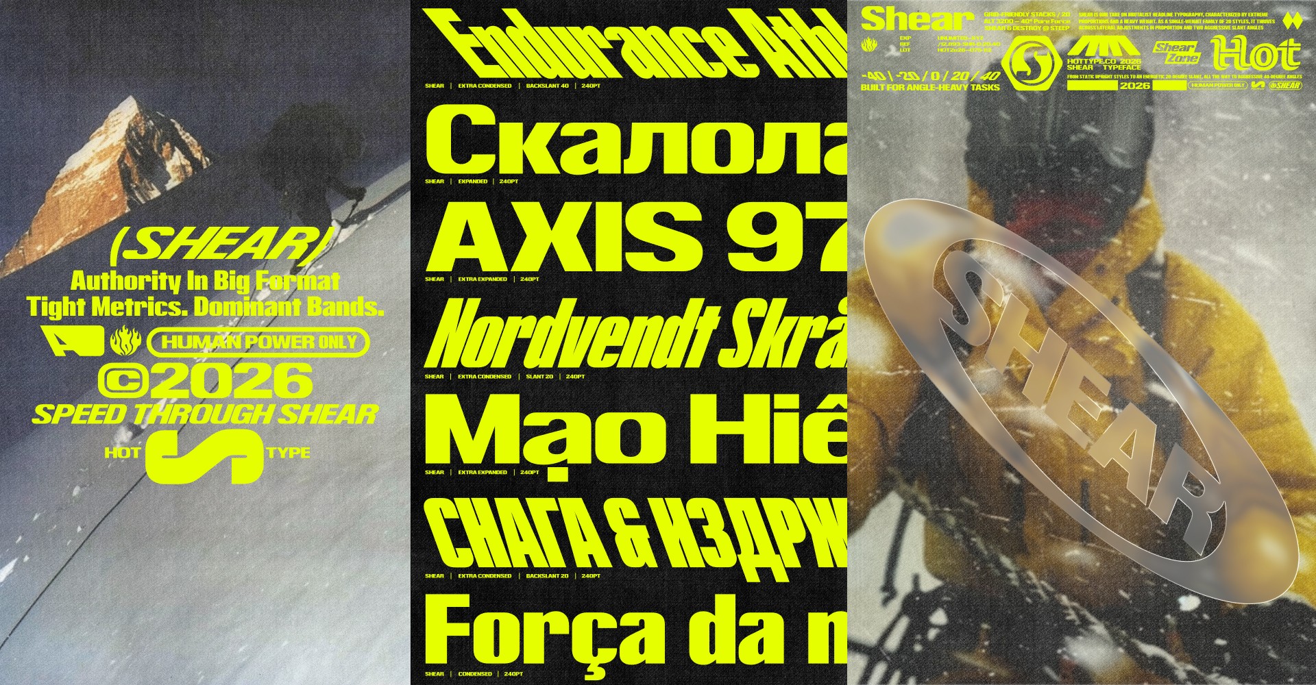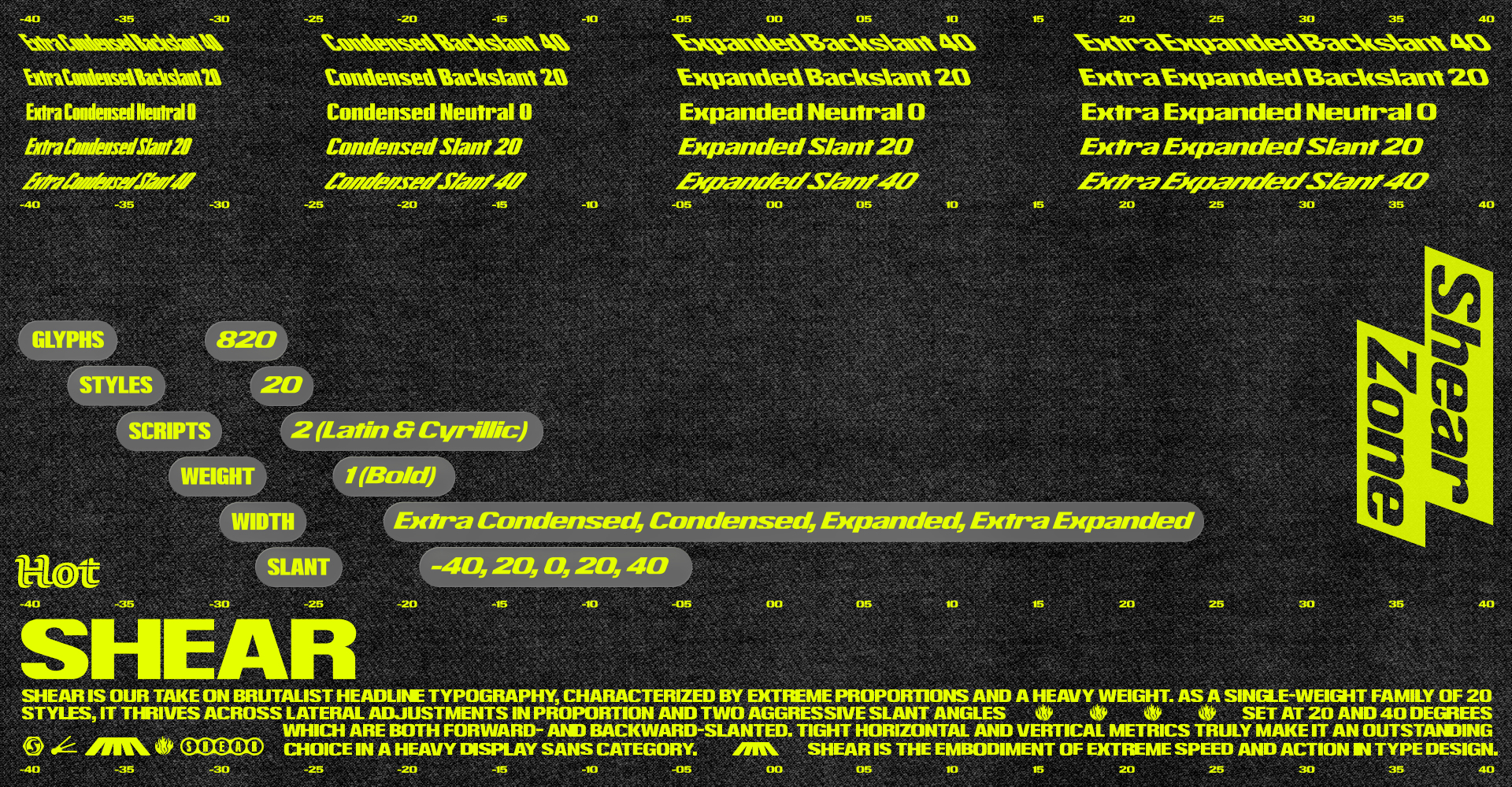 Shear is our take on brutalist headline typography, characterized by extreme proportions and a heavy weight. As a single-weight family of 20 styles, it thrives across lateral adjustments in proportion and two aggressive slant angles set at 20 and 40 degrees—which are both forward- and backward-slanted. Tight horizontal and vertical metrics truly make it an outstanding choice in a heavy display sans category. Shear is the embodiment of extreme speed and action in type design.