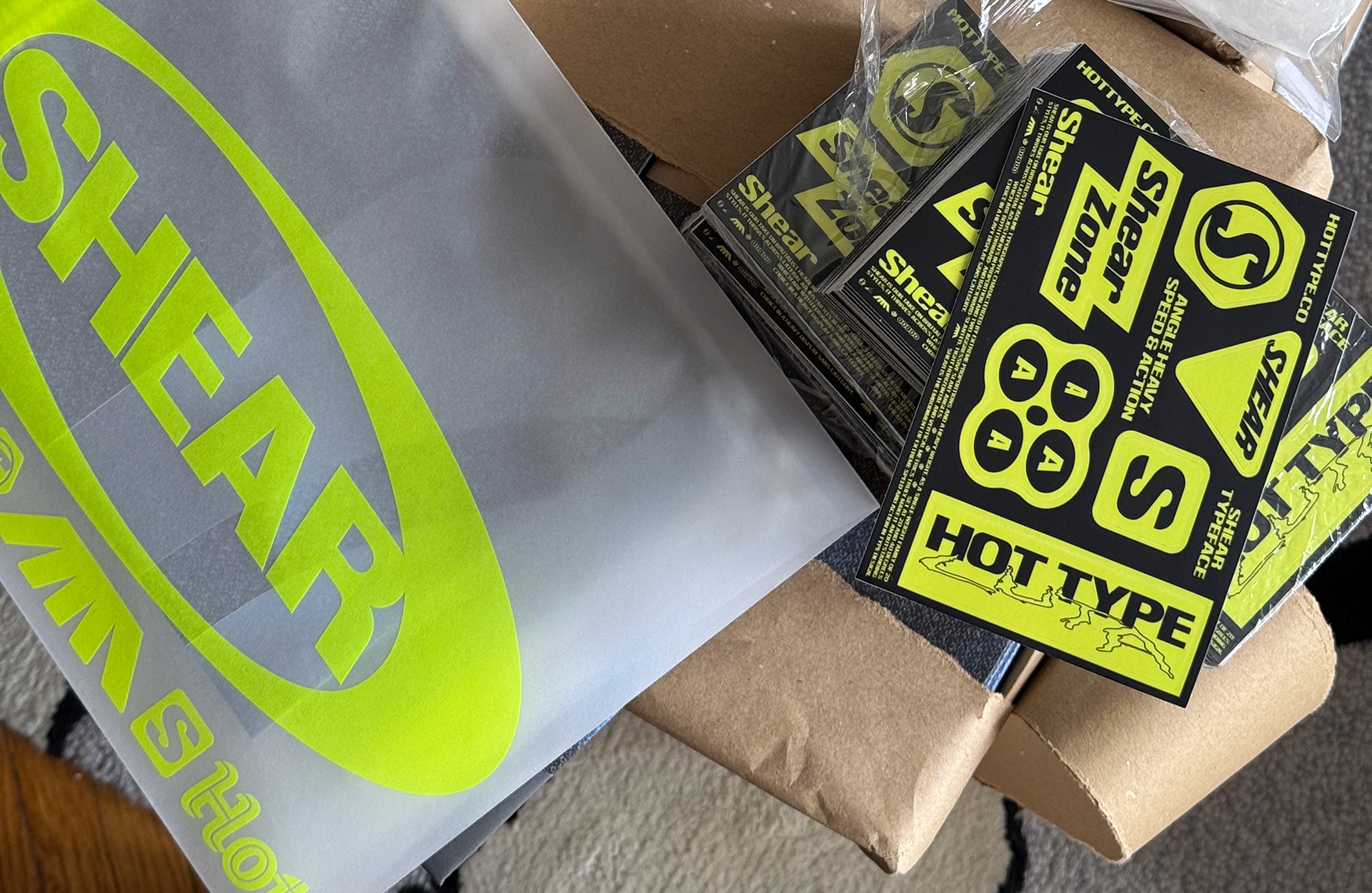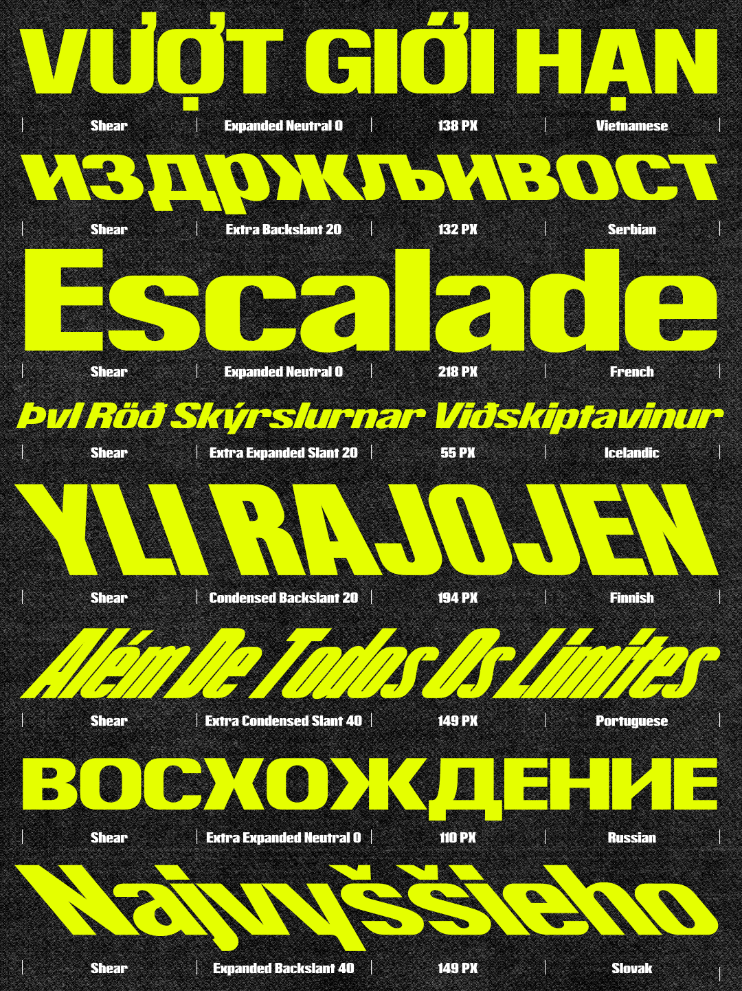 Instead of building hierarchy and loudness through the increase in weight, Shear offers a different approach—an angulation that goes in both positive and negative directions, with two aggressive slant angles at 20 and 40 degrees each way. This particular feature is what Shear got its name from, and that is what truly makes it an outstanding choice in a heavy display sans category. These angular styles allow us to further explore speed and action in type design, resulting in a type family that thrives doing the visual heavy lifting from layout to branding.