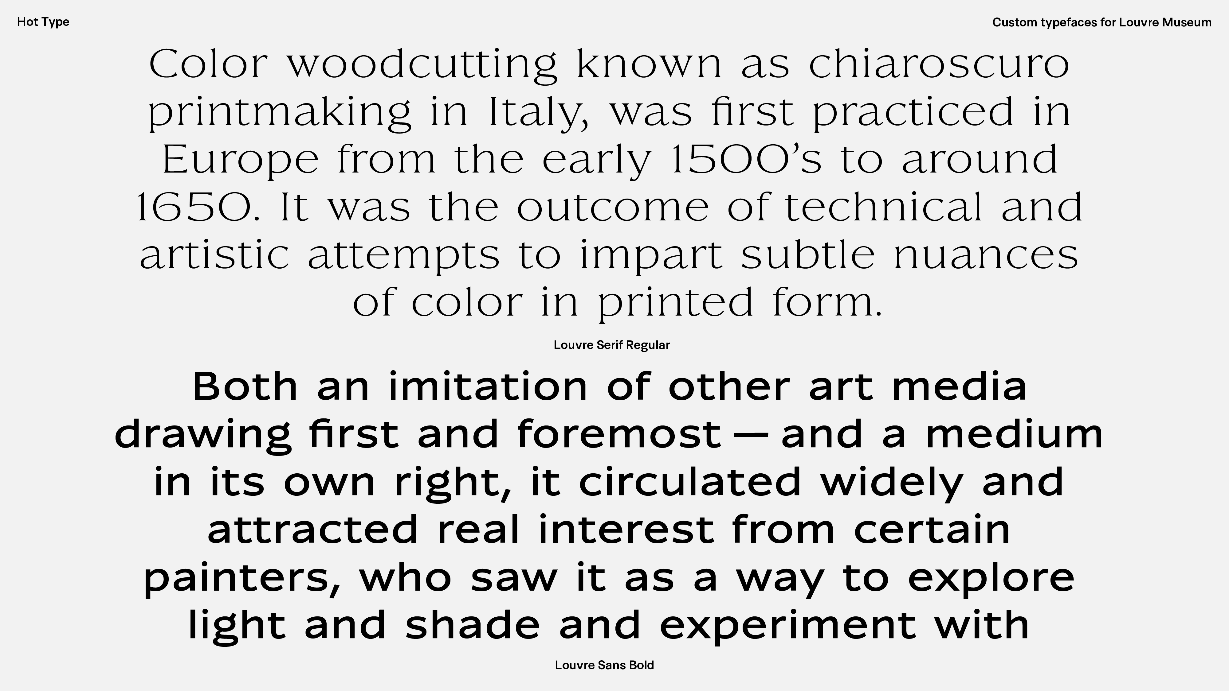 Louvre Sans is a clean, low contrast, humanist typeface that follows the same horizontal and vertical proportions of the Serif. It’s subtle irregularities connect the two designs, and bring in warmth to otherwise almost geometric shapes. Following the uppercase pattern, lowercase are characterized by quite wide proportion and pronounced upstrokes that connect two stems.