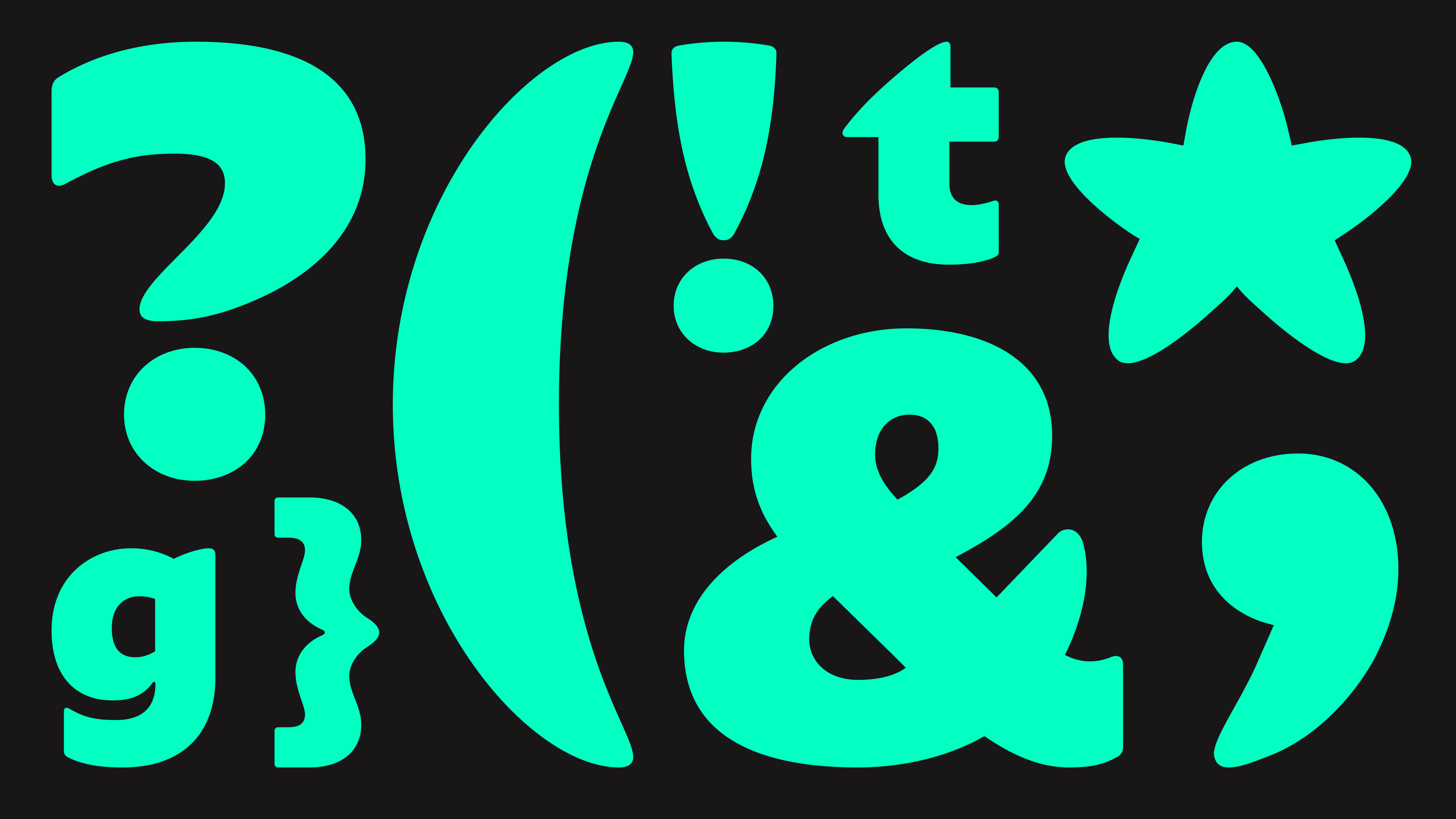 Punctuation in particular departs from the usual approach of smoothly fitting with the design of the letters. Quotes, comma, question and exclamation marks, ampersand, asterisk etc. are all quite brave in showcasing the brand character. With pointy but rounded terminations they further expand upon the Yettie anatomy present throughout the character set.